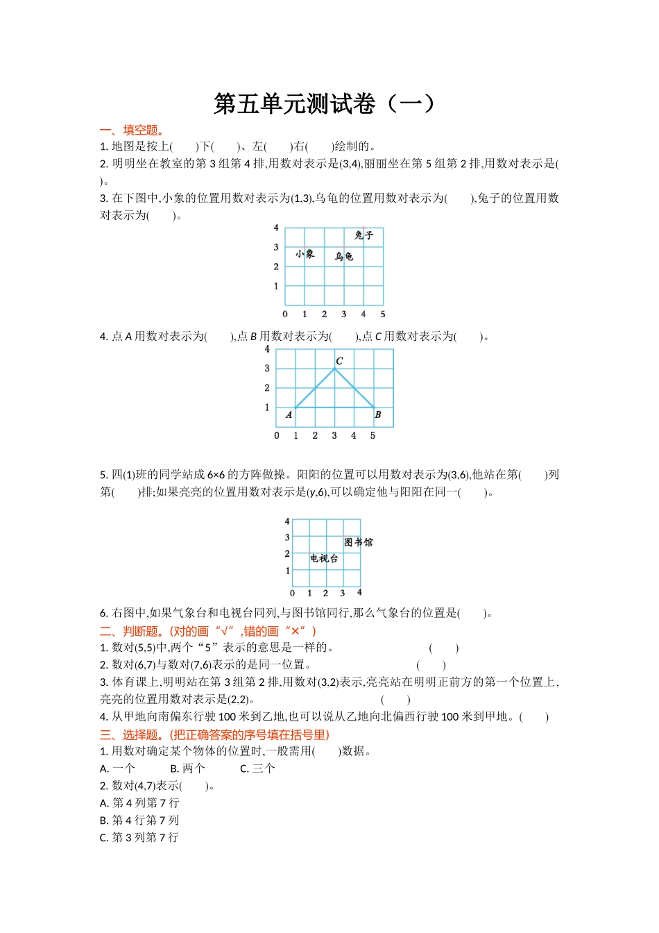 第五单元测试卷(一)一、填空题。1.地图是按上()下()、左()右()绘制的。2.明明坐在教室的第3组第4排,用数对表示是(3,4),丽丽坐在第5组第2排,用数对表示是()。3.在下图中,小象的位置用数对表示为(1,3),乌龟的位置...