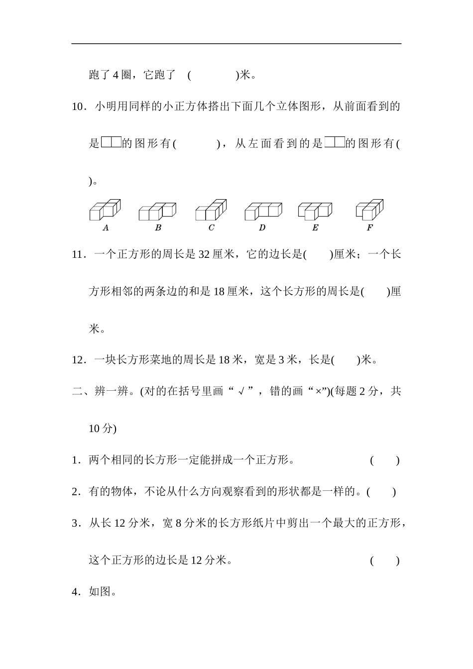 模块过关卷(二)几何一、填一填。(每题2分,共24分)1.一条绳子长6米,正好能沿着讲桌桌面的边沿绕2周,讲桌桌面的周长是()米。2.一个长方形的长是9厘米,宽是6厘米,它的周长是()厘米。3.乐乐站在一个位置观察...