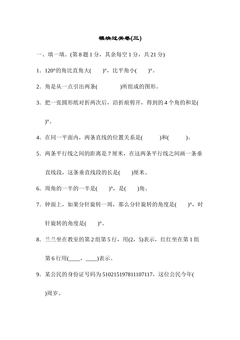 模块过关卷(三)一、填一填。(第8题1分,其余每空1分,共21分)1.120°的角比直角大()°,比平角小()°。2.角是从一点引出两条()所组成的图形。3.把一张圆形纸对折两次后,沿折痕剪开,得到的4个角的和是()°。4...