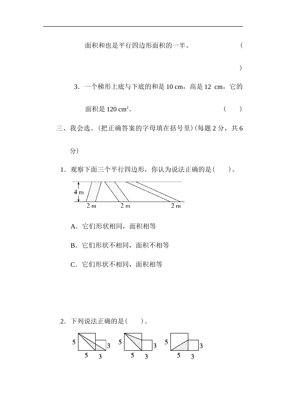 阴影与组合、规则与不规则面积的对比一、我会填。(每空2分,共22分)1.下图中,每个小方格的面积是1cm2,这个平行四边形的面积是()cm2,阴影部分的面积是()cm2。2.如图,将长方形框拉成平行四边形后,平行四边形...