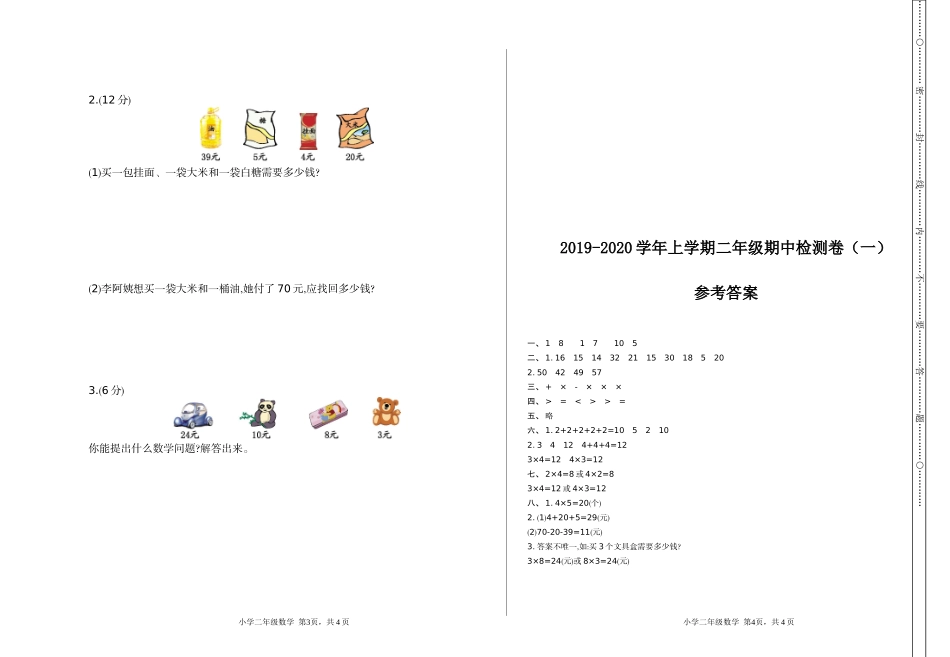 …………○…………密…………封…………线…………内…………不…………要…………答…………题…………○…………准考证号:姓名:班级:2019-2020学年上学期二年级期中检测卷(一)班级:姓名:满分:100分考...