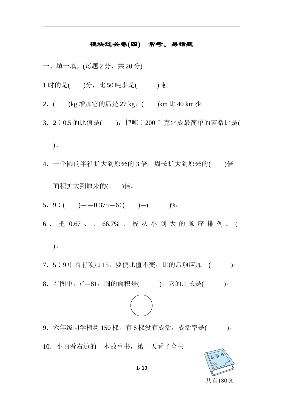 模块过关卷(四)常考、易错题一、填一填。(每题2分,共20分)1.时的是()分,比50吨多是()吨。2.()kg增加它的后是27kg,()km比40km少。3.2∶0.5的比值是(),把吨∶200千克化成最简单的整数比是()。4.一个圆的半径...
