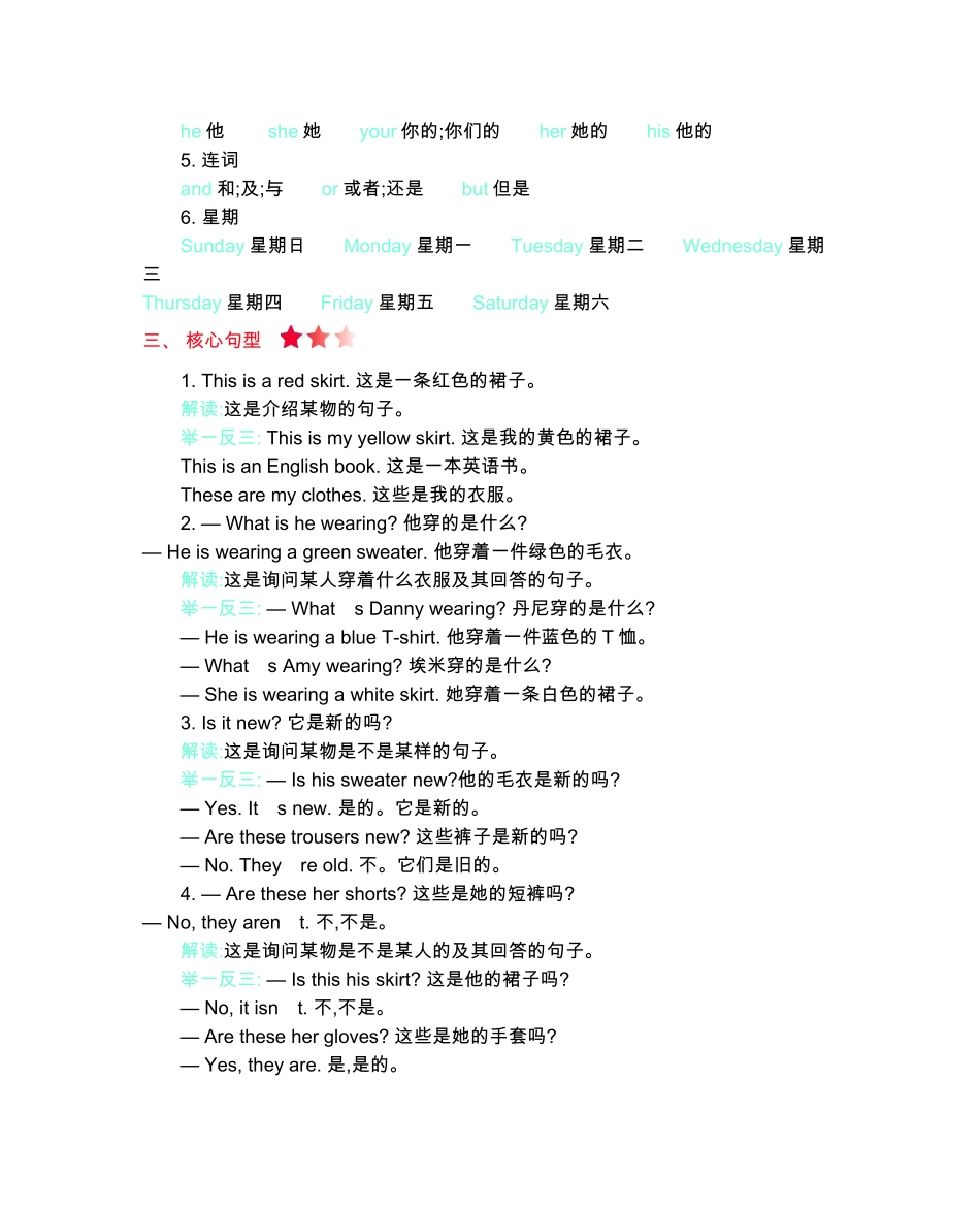UNITTheClothesWeWear一、核心词汇1.服装类的名词shirt(尤指男式的)衬衫skirt裙子trousers裤子sweater毛衣,线衣coat大衣;外套cap(有帽舌的)帽子dress连衣裙shoe鞋sock短袜shorts短裤(复数)2.指示代词this这,这个t...