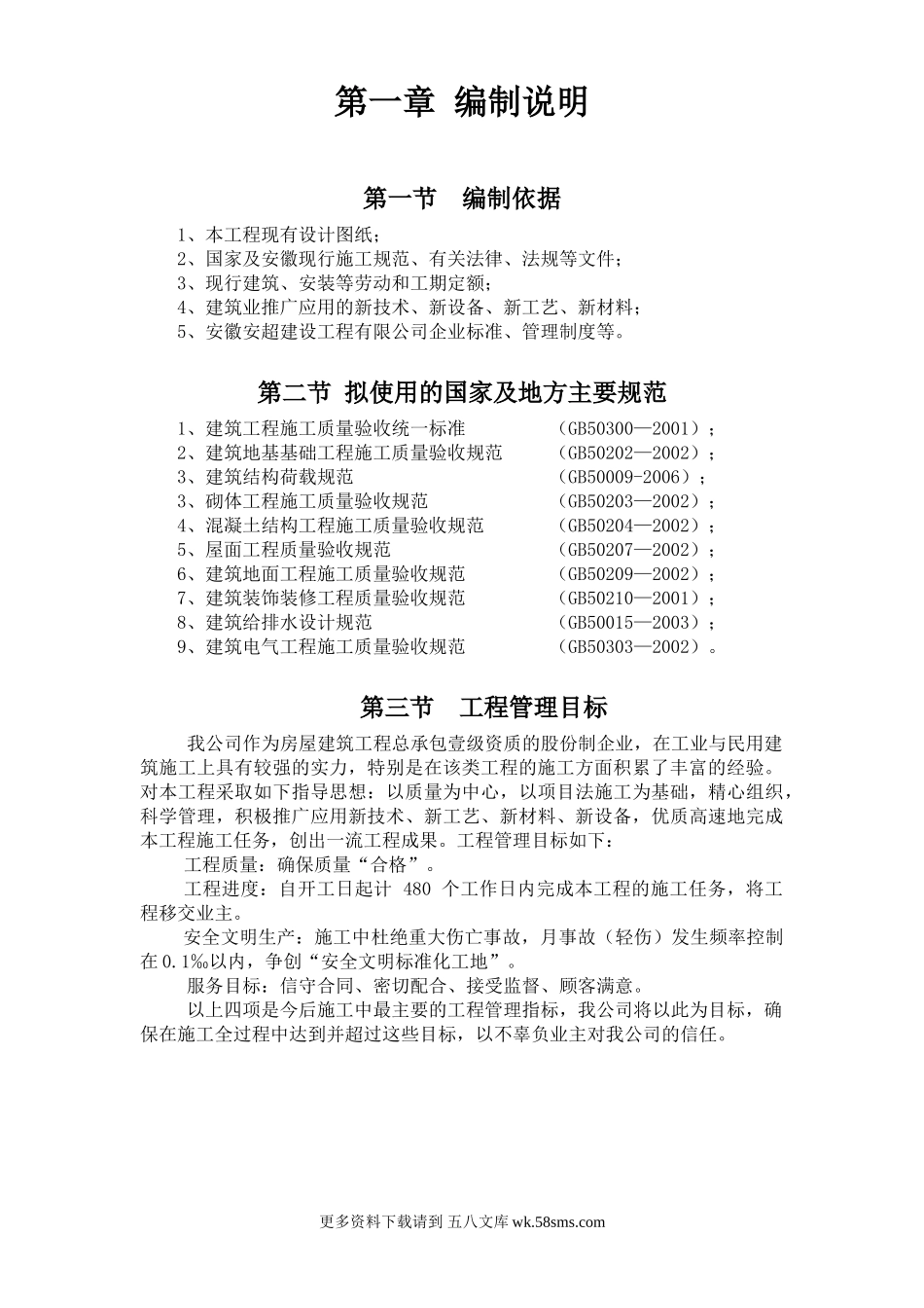 目录第一章编制说明..........................................1第一节编制依据.......................................1第二节拟使用的国家及地方主要规范.....................1第三节工程管理目标.............