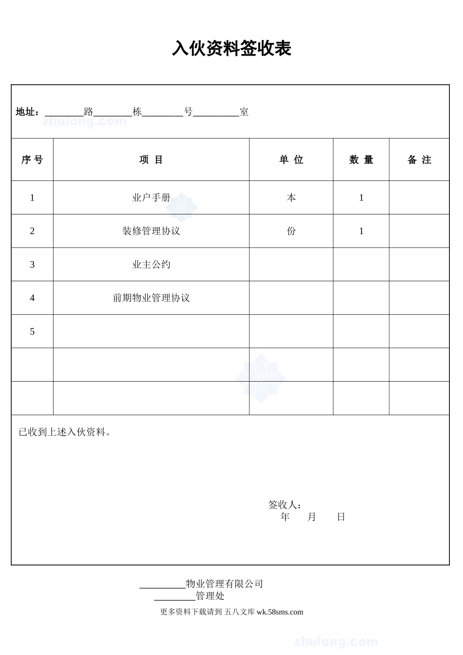 入伙资料签收表地址:路栋号室序号项目单位数量备注1业户手册本12装修管理协议份13业主公约4前期物业管理协议5已收到上述入伙资料。签收人:年月日物业管理有限公司管理处更多资料下载请到五八文库wk.58sms.com