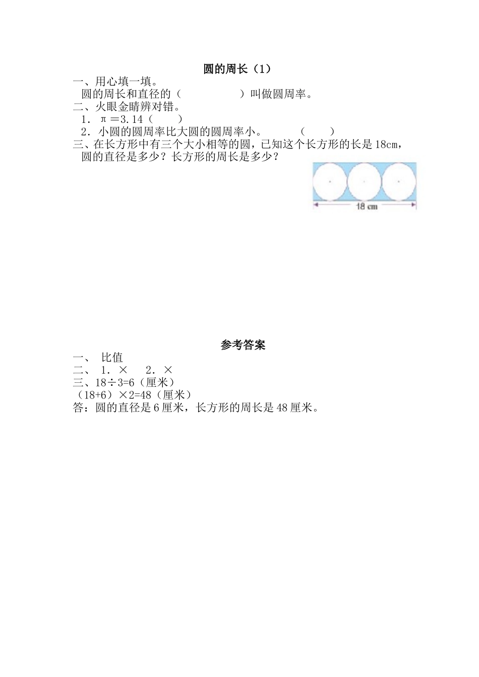 圆的周长(1)一、用心填一填。圆的周长和直径的()叫做圆周率。二、火眼金睛辨对错。1.π=3.14()2.小圆的圆周率比大圆的圆周率小。()三、在长方形中有三个大小相等的圆,已知这个长方形的长是18cm,圆的...