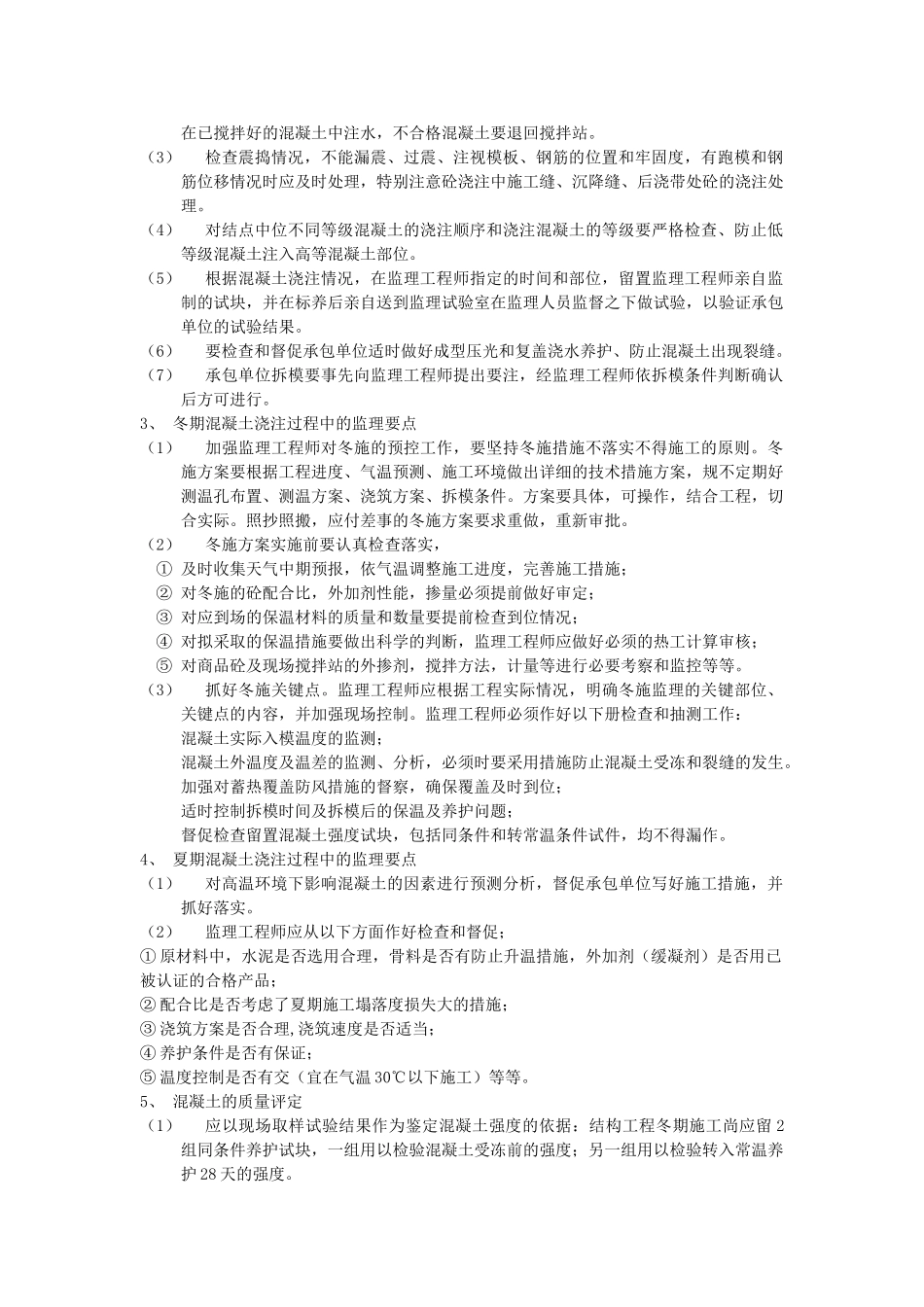 混凝土分项工程施工质量监理实施细则(一)混凝土生产和施工过程1.模板必须保证工程结构和构件各部分形状,尺寸和相互位置的准确,施工前要做好模板的配板设计,模板和支撑有足够的承载力和刚度,确保砼结构在浇...
