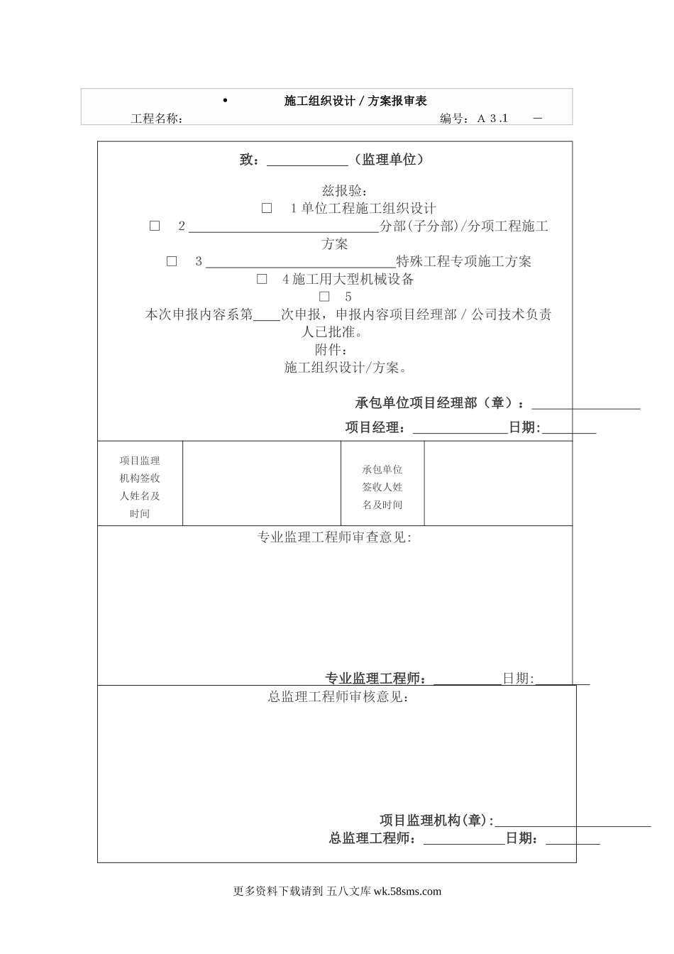 施工组织设计/方案报审表工程名称:编号:A3.1-致:(监理单位)兹报验:□1单位工程施工组织设计□2分部(子分部)/分项工程施工方案□3特殊工程专项施工方案□4施工用大型机械设备□5本次申报内容系第次...