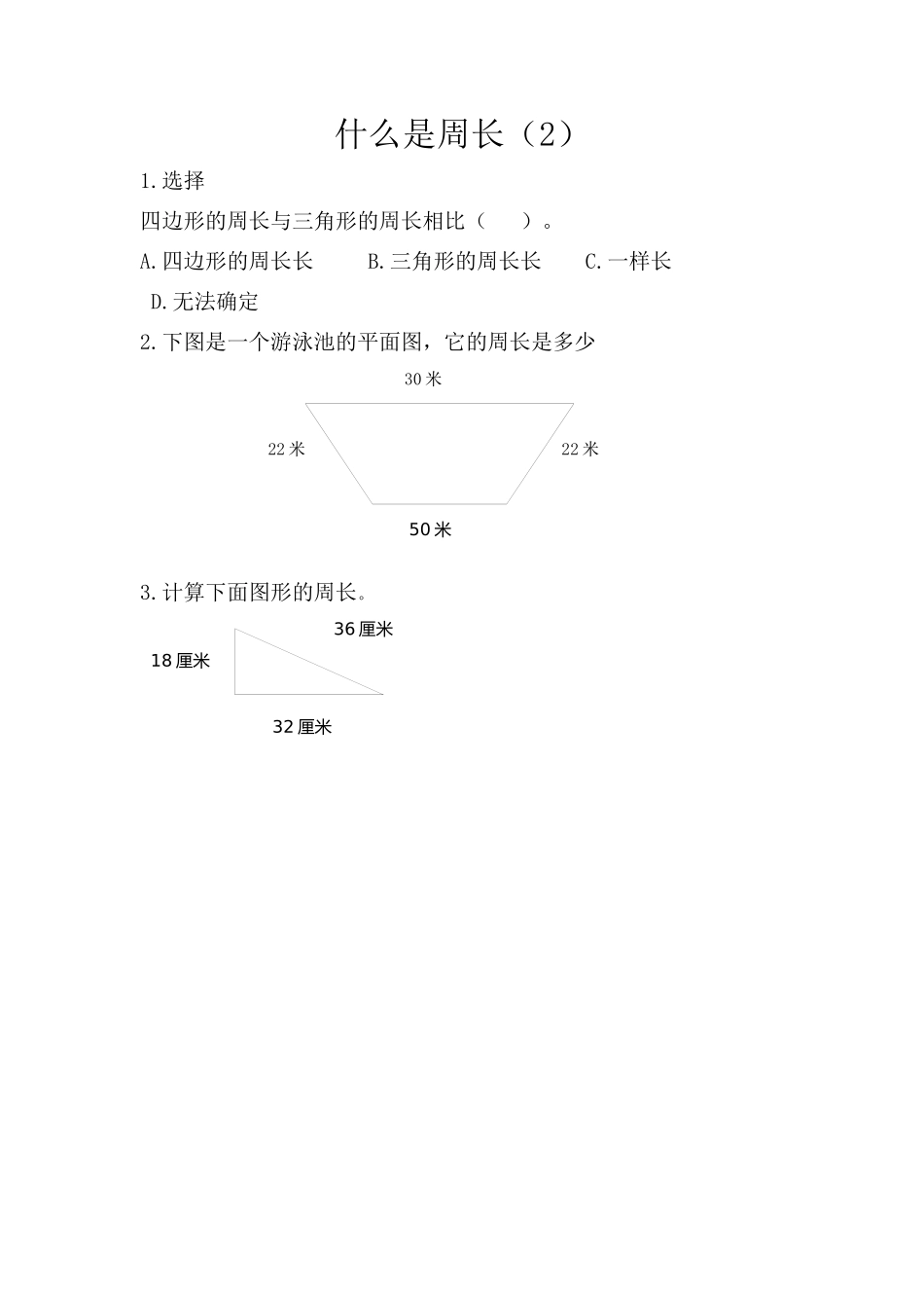 什么是周长(2)1.选择四边形的周长与三角形的周长相比()。A.四边形的周长长B.三角形的周长长C.一样长D.无法确定2.下图是一个游泳池的平面图,它的周长是多少30米22米22米3.计算下面图形的周长。50米32厘米18厘...