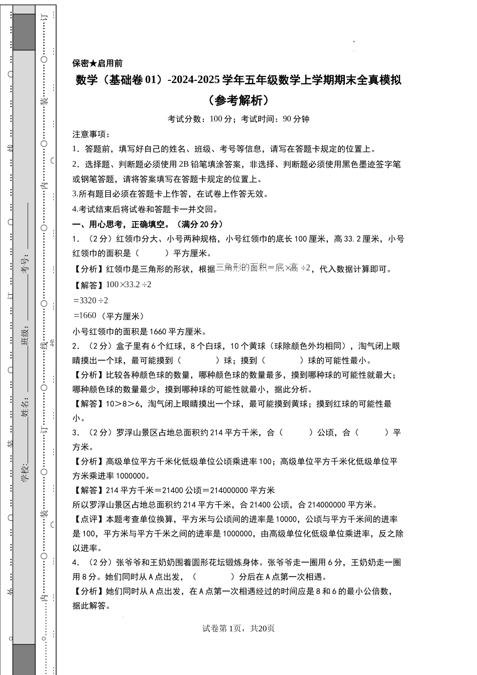 数学(基础卷01) -2024-2025学年五年级数学上学期期末全真模拟(北师大版)(参考解析).docx_第2页