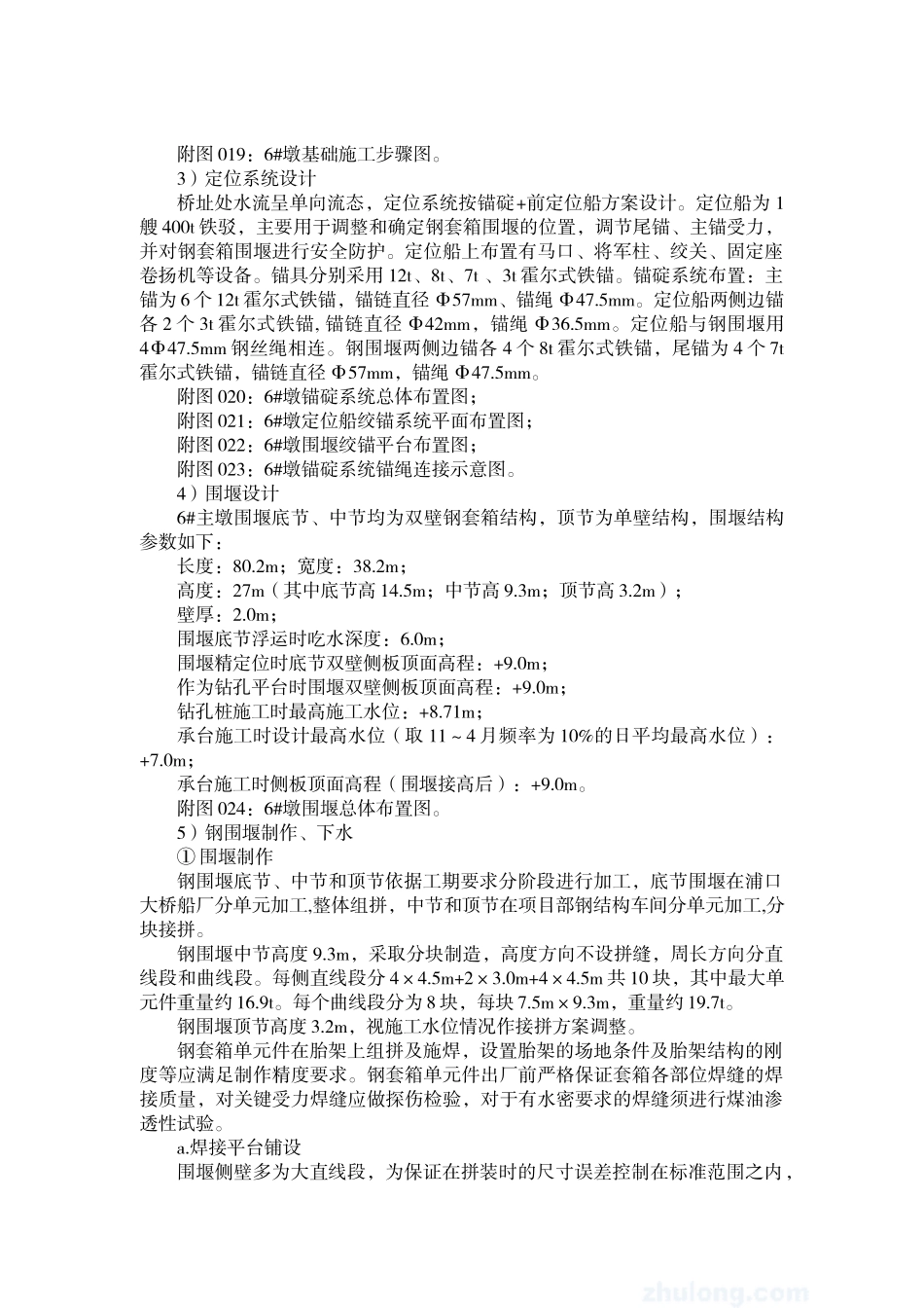 第四章下部结构施工方案、方法1、施工总体方案根据工程特点和总工期的要求,为尽可能少地占用长江水运航道,同时又能满足正常施工需要,确定按两个枯水期分期实施主桥三个主墩的基础施工,第一个枯水期先开工北主...