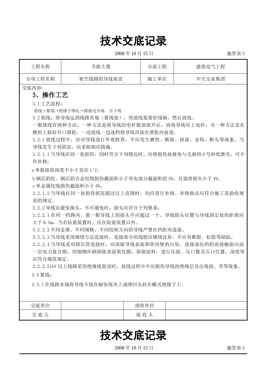 技术交底记录2008年10月15日施管表5工程名称节能大厦分部工程建筑电气工程分项工程名称架空线路的导线架设施工单位中天宝业集团交底内容:依据标准:《建筑工程施工质量验收统一标准》GB50300-2001《建筑电气工程...