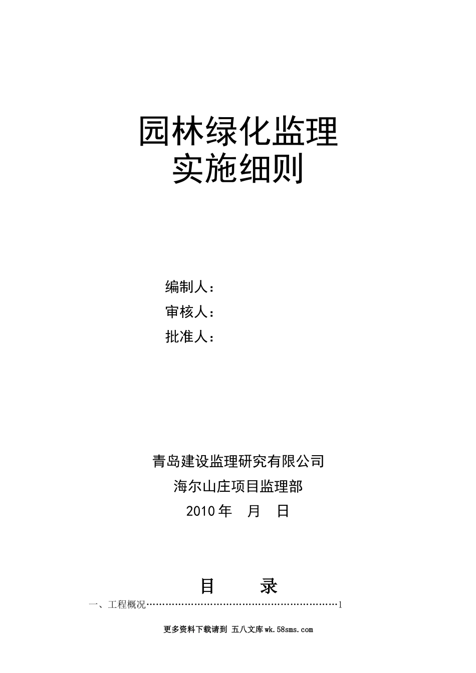 园林绿化监理实施细则编制人:审核人:批准人:青岛建设监理研究有限公司海尔山庄项目监理部2010年月日目录一、工程概况……………………………………………………1更多资料下载请到五八文库wk.58sms.com二、专业...