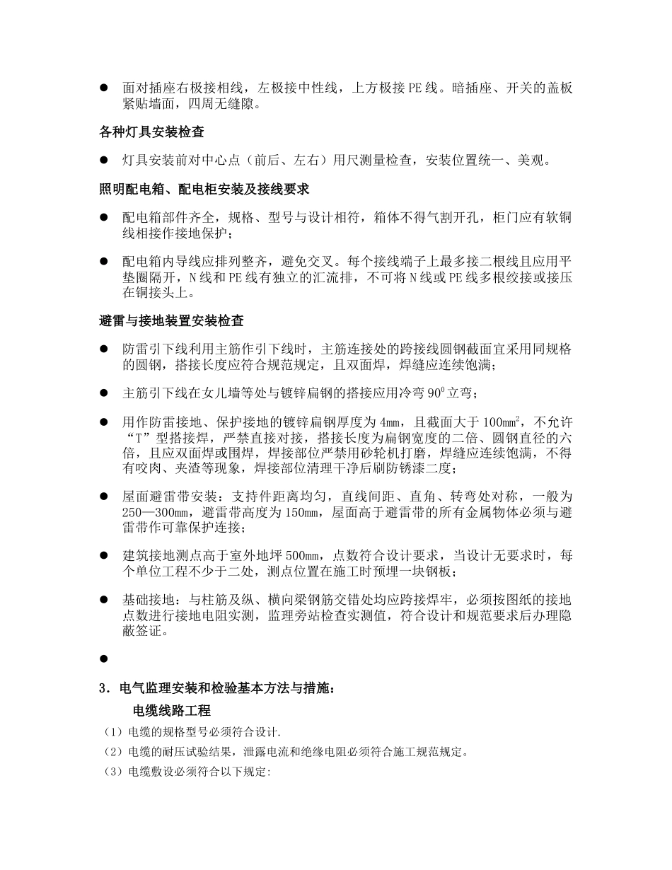 电气工程施工监理细则1.工程电气安装特点:采用三相四线(380V/220V)供电方式,由小区电网采用VV四芯电缆穿镀锌钢管埋地引入各幢楼内接线箱或总配电箱后改用三相五线制输配各分配电箱或计量配电箱,导线采用BV...