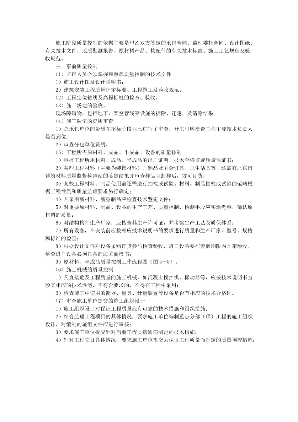 通用质量控制实施细则一、施工阶段质量控制系统过程1.质量事前控制1)施工准备工作质量控制a.工程原材料、构配件质量控制b.施工所需机械设备质量控制c.施工现场、技术、管理、环境质量控制2)施工队伍资质审查3)...