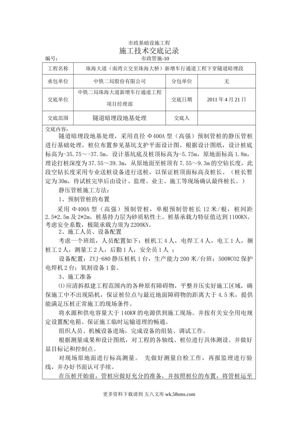 市政基础设施工程施工技术交底记录编号:市政管施-10工程名称珠海大道(南湾立交至珠海大桥)新增车行通道工程下穿隧道暗埋段承包单位中铁二局股份有限公司分包单位无交底单位中铁二局珠海大道新增车行通道工程项...