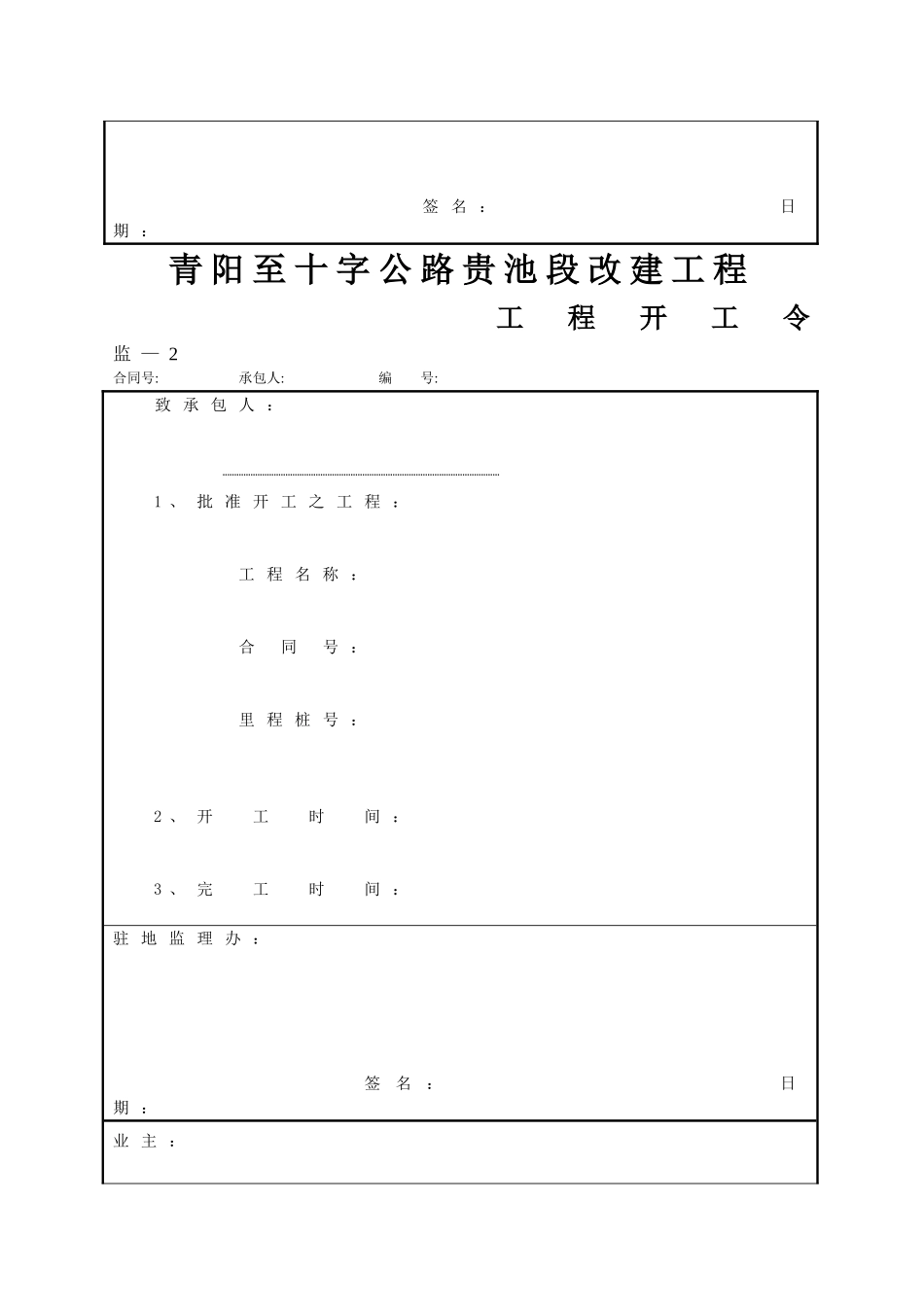 施工监理表青阳至十字公路贵池段改建工程工程开工申请监—1合同号:承包人:编号:更多资料下载请到五八文库wk.58sms.com建设项目名称:合同段工程名称:里程桩号:工程主要内容:施工准备情况说明:人员、机械及材料均已...