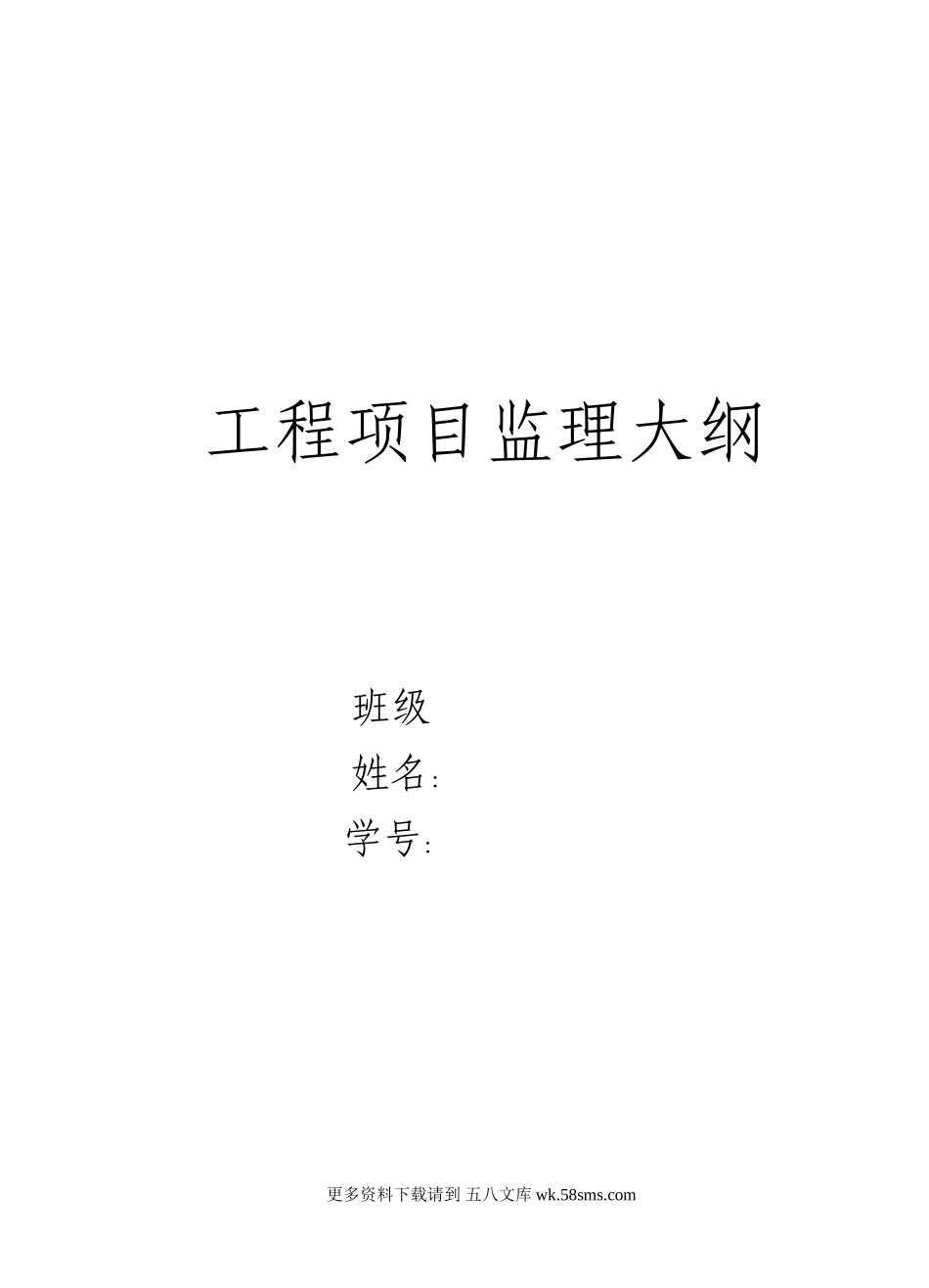 工程项目监理大纲班级姓名:学号:更多资料下载请到五八文库wk.58sms.com目录一、工程概况与特点(一)、工程概况1、工程名称2、建设单位3、设计单位4、建设地点5、工程规模6、总造价7、质量目标8、投资目标9、工...