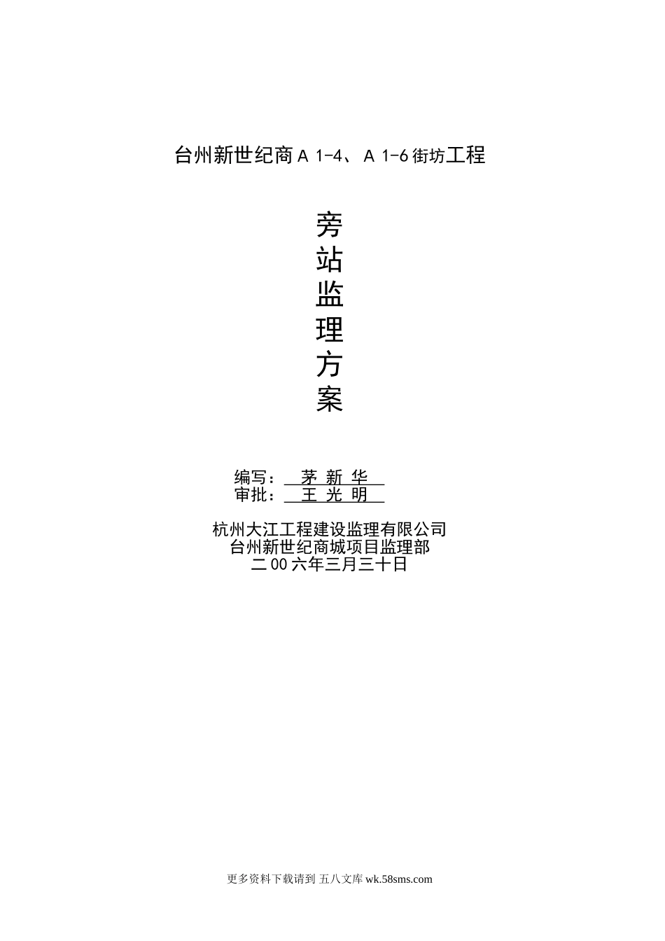 台州新世纪商A1-4、A1-6街坊工程旁站监理方案编写:茅新华审批:王光明杭州大江工程建设监理有限公司台州新世纪商城项目监理部二00六年三月三十日更多资料下载请到五八文库wk.58sms.com目录1、工程概况2、结构...