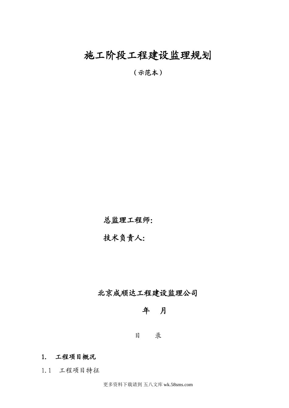 施工阶段工程建设监理规划(示范本)总监理工程师:技术负责人:北京成顺达工程建设监理公司年月目录1.工程项目概况1.1工程项目特征更多资料下载请到五八文库wk.58sms.com1.1.1项目名称1.1.2建设地点1.1.3建设规...