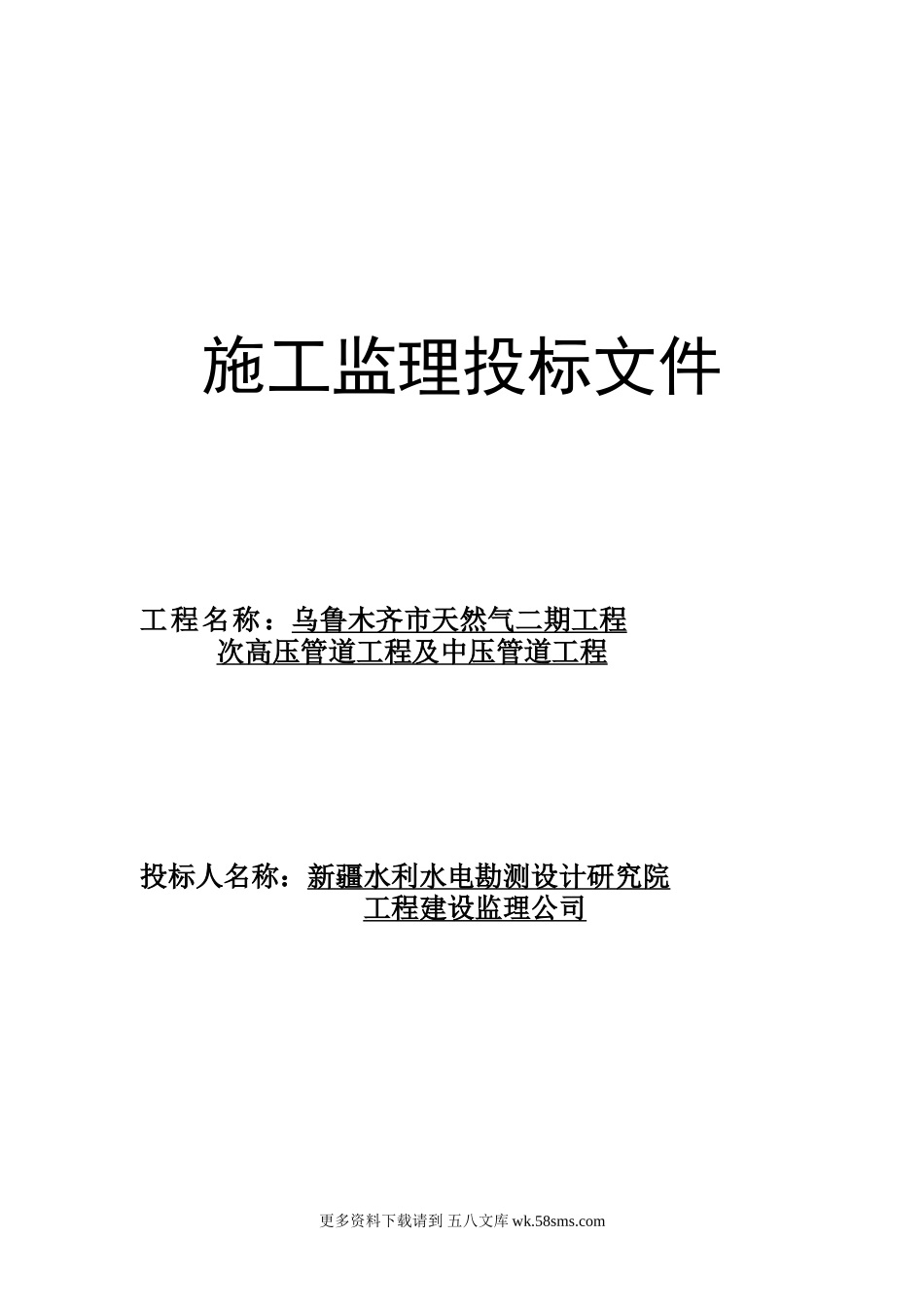 施工监理投标文件工程名称:乌鲁木齐市天然气二期工程次高压管道工程及中压管道工程投标人名称:新疆水利水电勘测设计研究院工程建设监理公司更多资料下载请到五八文库wk.58sms.com目录1投标承诺书.................