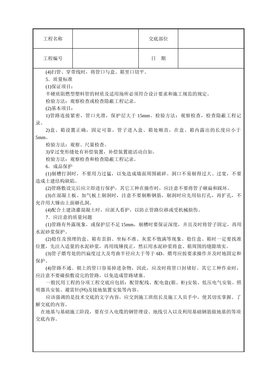 工程名称交底部位工程编号日期交底内容:建筑电气安装工程(一)技术交底电气安装工程中的各分项工程的技术交底均应包括以下内容:1.对材料、设备的要求;2.主要机具;3.作业条件;4操作工艺;5.质量标准;6....