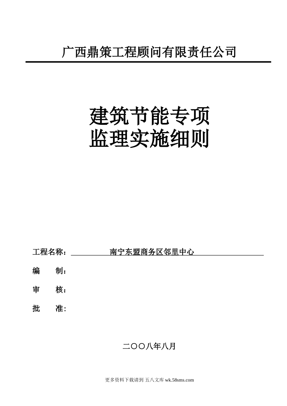 广西鼎策工程顾问有限责任公司建筑节能专项监理实施细则工程名称:南宁东盟商务区邻里中心编制:审核:批准:二○○八年八月更多资料下载请到五八文库wk.58sms.com目录第一章总论...................................