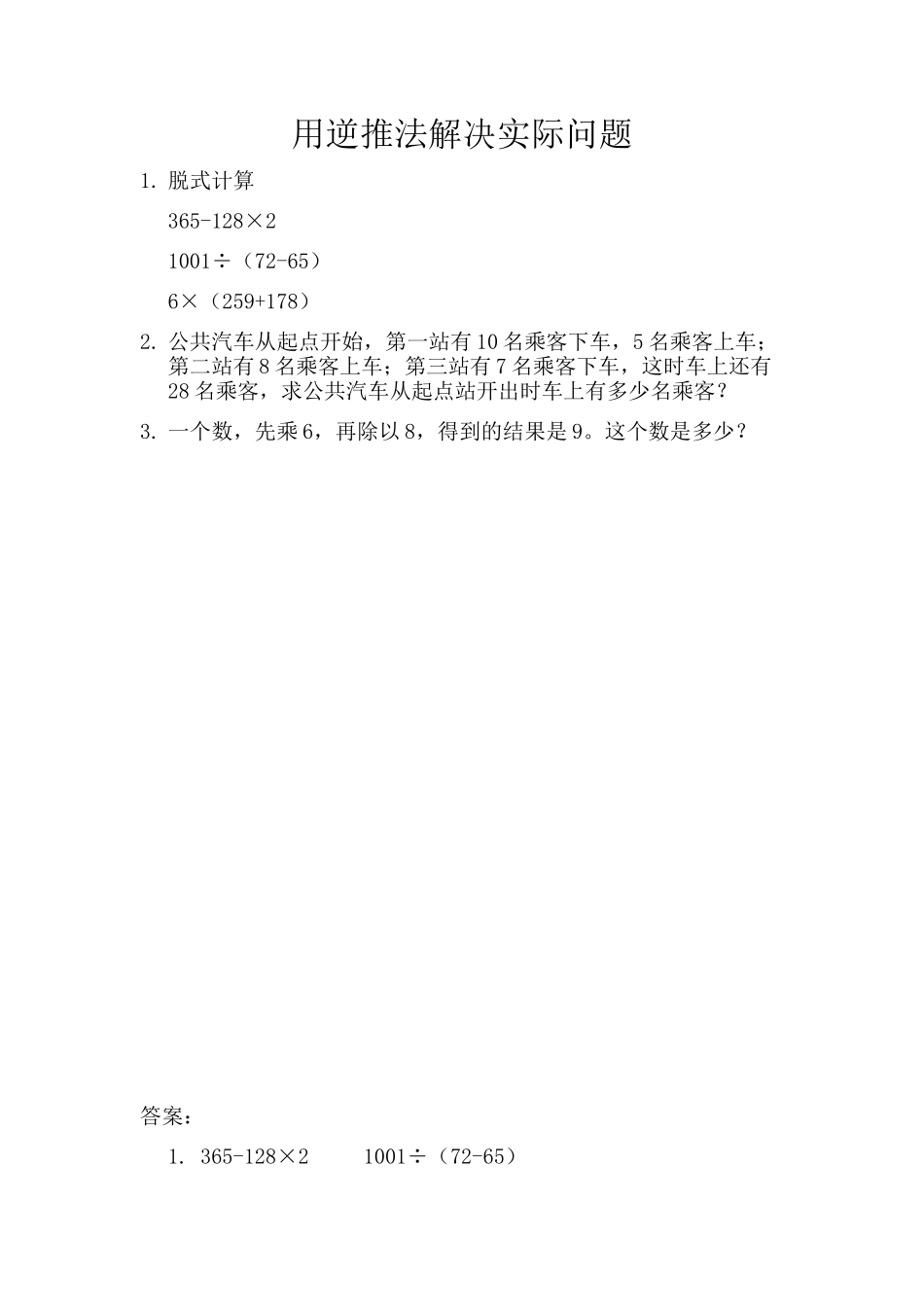 用逆推法解决实际问题1.脱式计算365-128×21001÷(72-65)6×(259+178)2.公共汽车从起点开始,第一站有10名乘客下车,5名乘客上车;第二站有8名乘客上车;第三站有7名乘客下车,这时车上还有28名乘客,求公共...