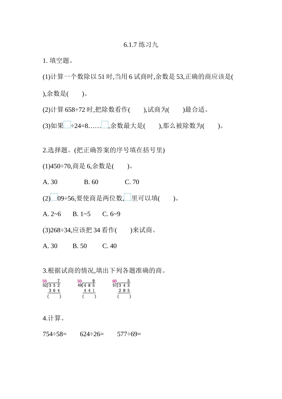 6.1.7练习九1.填空题。(1)计算一个数除以51时,当用6试商时,余数是53,正确的商应该是(),余数是()。(2)计算658÷72时,把除数看作(),试商为()最合适。(3)如果÷24=8……,余数最大是(),那么被除数为()。2.选择题。(把...