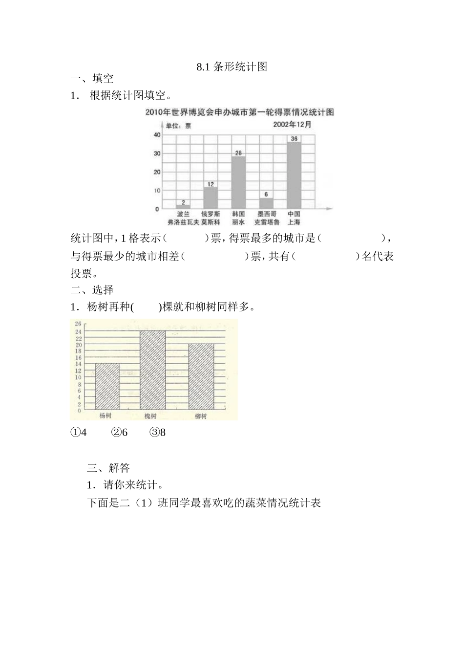 8.1条形统计图一、填空1.根据统计图填空。统计图中,1格表示()票,得票最多的城市是(),与得票最少的城市相差()票,共有()名代表投票。二、选择1.杨树再种()棵就和柳树同样多。①4②6③8三、解答1.请...