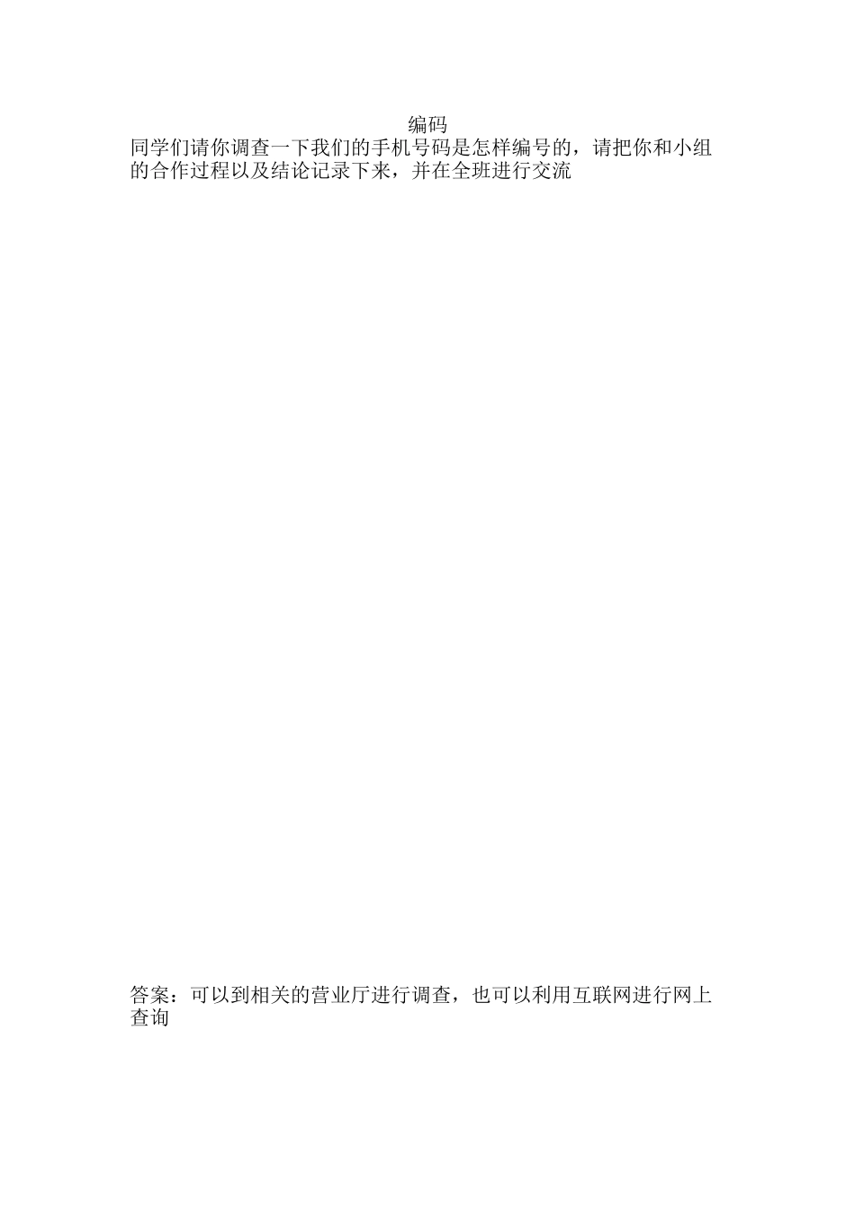 编码同学们请你调查一下我们的手机号码是怎样编号的,请把你和小组的合作过程以及结论记录下来,并在全班进行交流答案:可以到相关的营业厅进行调查,也可以利用互联网进行网上查询