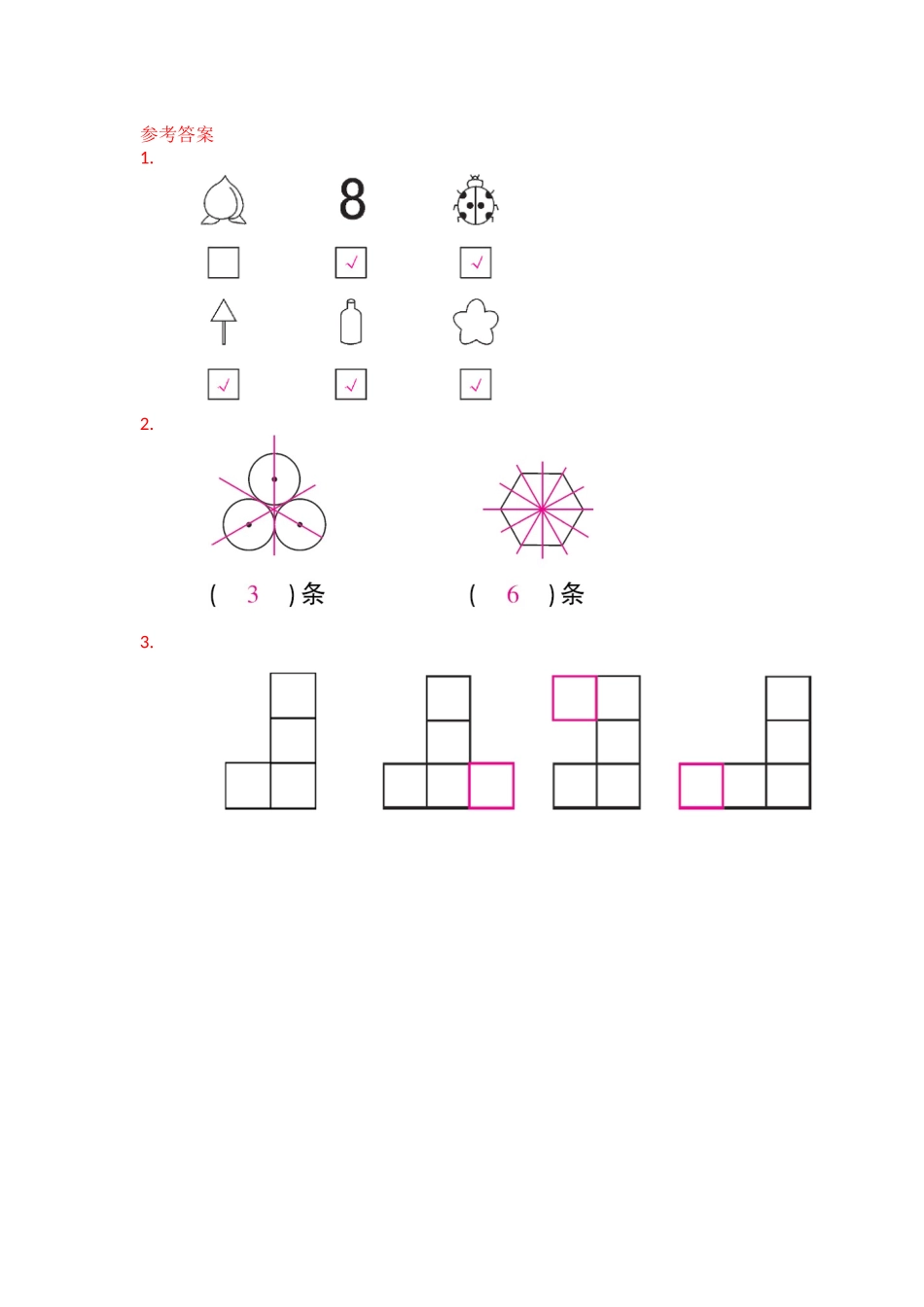 1.下列哪些图形是轴对称图形?,在□内画√。2.画出下面图形的对称轴,看看能画几条?()条()条3.在下列图形上补一个小正方形,使它们成为轴对称图形,你有多少种画法?参考答案1.2.3.