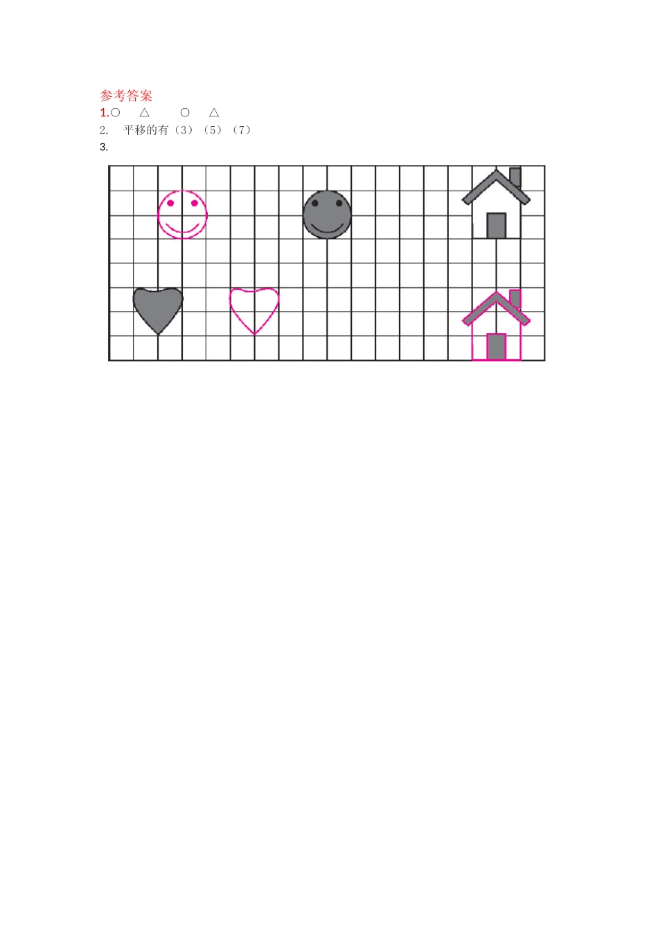 1.下面物体的运动是平移的画“△”,不是平移的画“○”。2.把可以平移到与同一位置的长方形涂上颜色。3.按要求画一画(1)笑脸向左平移6格;(2)桃心向右平移4格;(3)房屋向下平移5格子参考答案1.○△○△2....