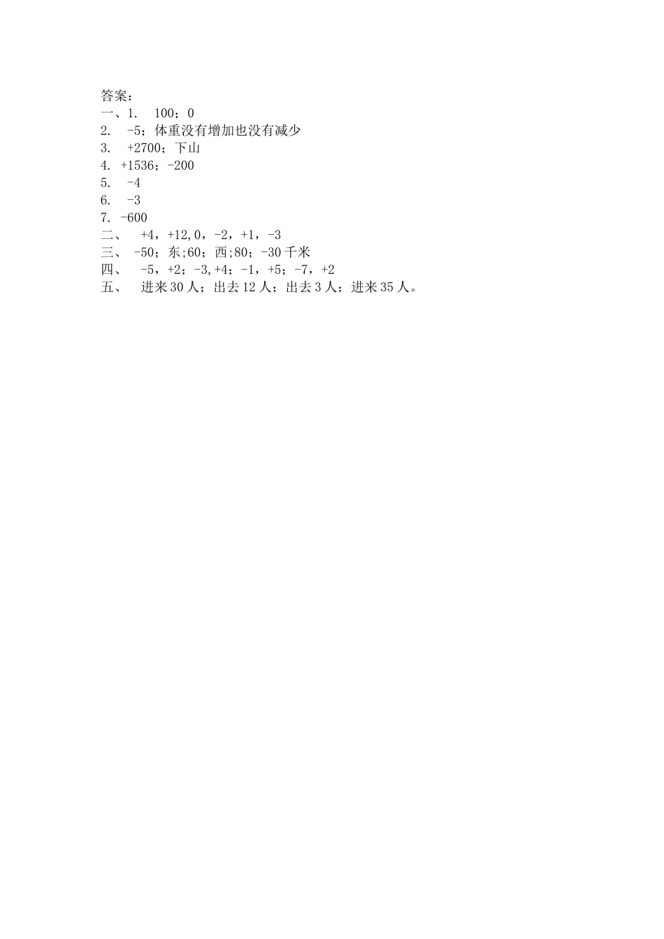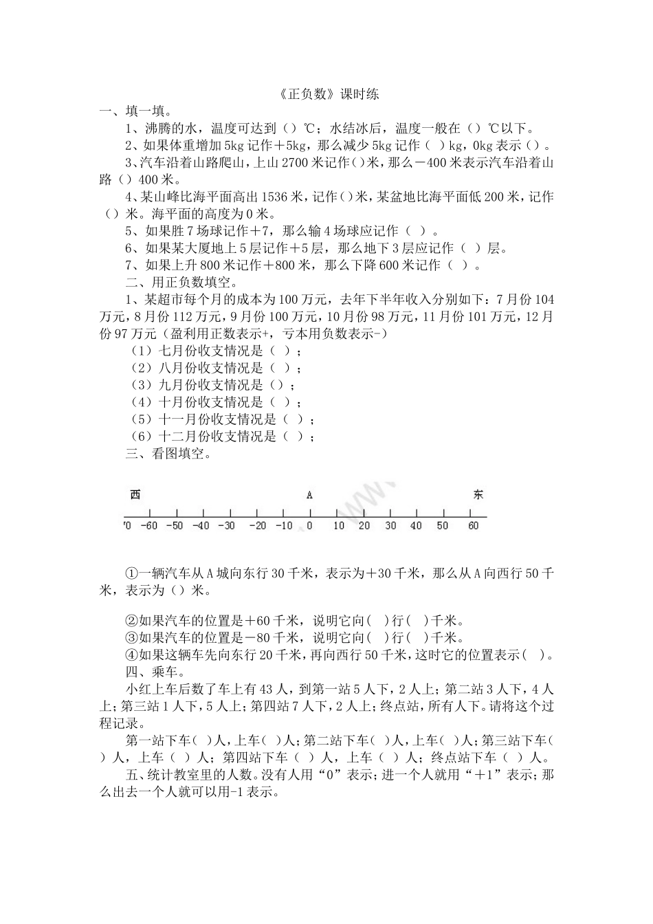 《正负数》课时练一、填一填。1、沸腾的水,温度可达到()℃;水结冰后,温度一般在()℃以下。2、如果体重增加5kg记作+5kg,那么减少5kg记作()kg,0kg表示()。3、汽车沿着山路爬山,上山2700米记作()米...