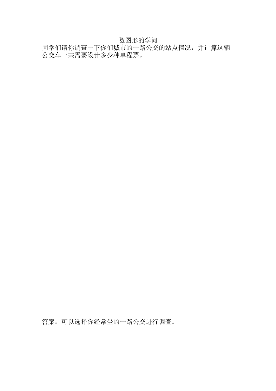 数图形的学问同学们请你调查一下你们城市的一路公交的站点情况,并计算这辆公交车一共需要设计多少种单程票。答案:可以选择你经常坐的一路公交进行调查。