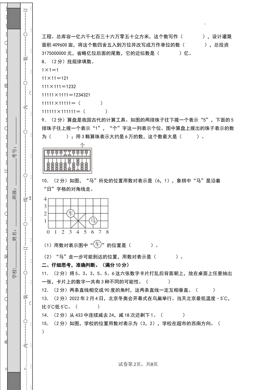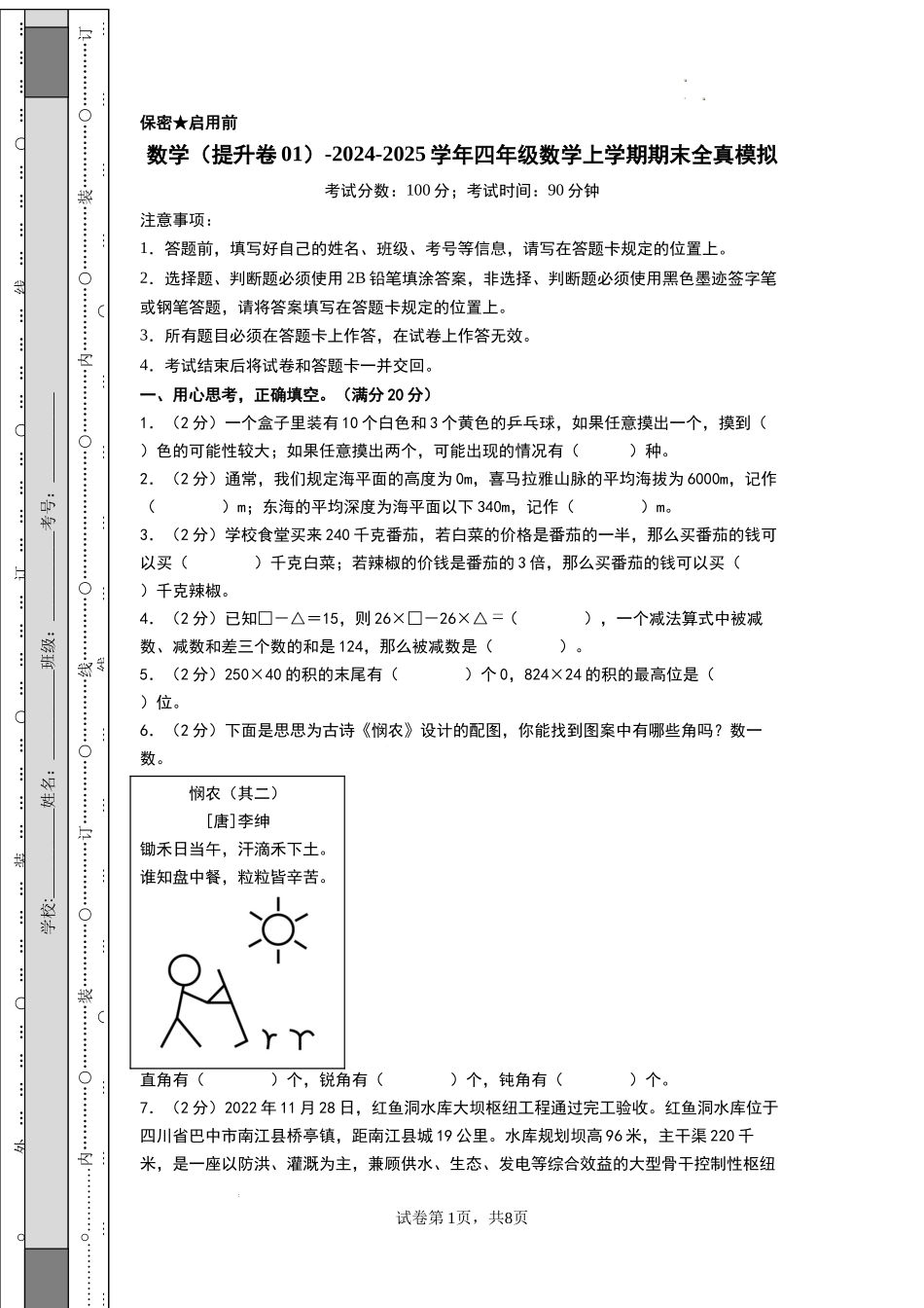 数学(提升卷01) -2024-2025学年四年级数学上学期期末全真模拟(北师大版)(考试版A4).docx_第2页