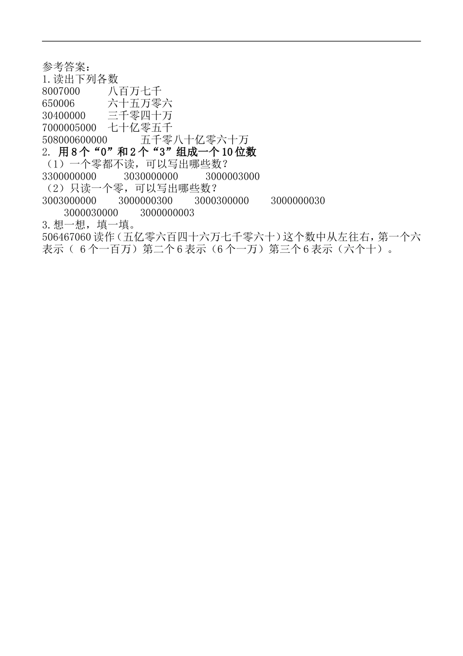 1.2.1大数的读法1.读出下列各数80070006500063040000070000050005080006000002.用8个“0”和2个“3”组成一个10位数(1)一个零都不读,可以写出哪些数?(2)只读一个零,可以写出哪些数?3.想一想,填一填。506...