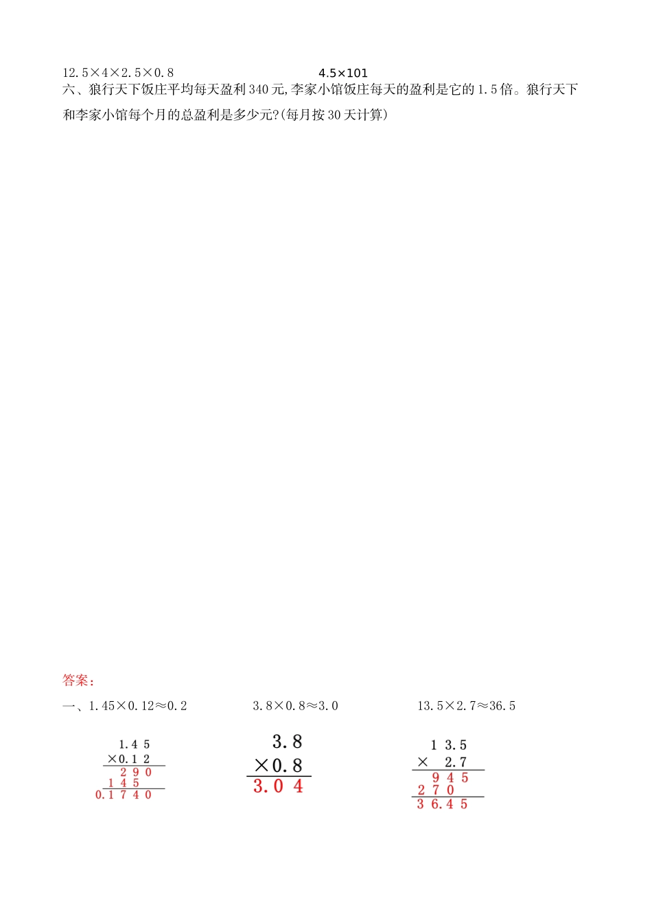 1.2.5练习四一、列竖式计算。(得数保留一位小数)1.45×0.12≈3.8×0.8≈13.5×2.7≈二、判断题。(对的画“􀳫”,错的画“✕”)1.0.02与0.6的积是0.12。()2.一个小数的0.9倍一定大于这个小数。()3.2.36保留一位小数...