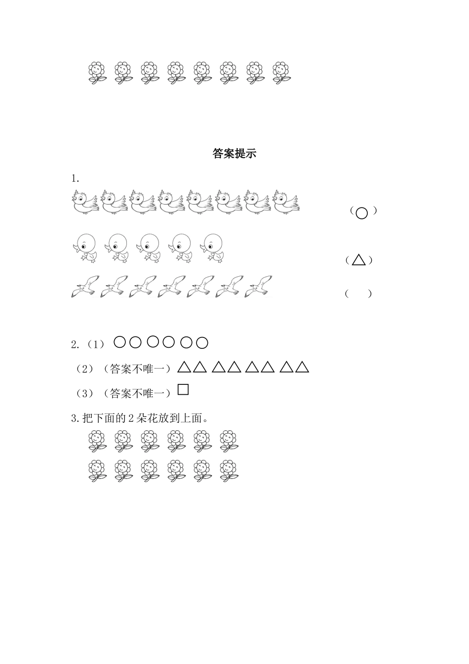 用一一对应的方法比较大小1.在最多的物体后面画“”,最少的物体后面画“”。()()()2.画一画。(1)画,和一样多。(2)画,比多。(3)画,比少。3.要使上下两行花一样多,可以怎么办?说一说,做一做。答...