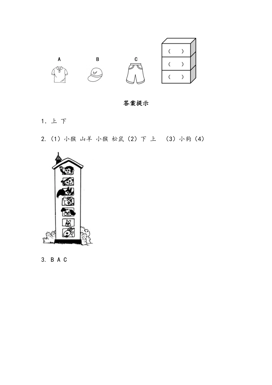 上下1.看图找位置。(填一填)小熊在大象的()面,大象在小熊的()面。2.看一看,说一说。(1)这座楼房中()住在最上面,()住在最下面。小猫的楼上住的是(),楼下住的是()。(2)小狗住在小鹿的()面...