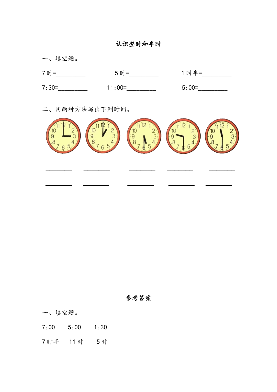 认识整时和半时一、填空题。7时=_________5时=_________1时半=_________7:30=_________11:00=_________5:00=_________二、用两种方法写出下列时间。___________________________________________________________...