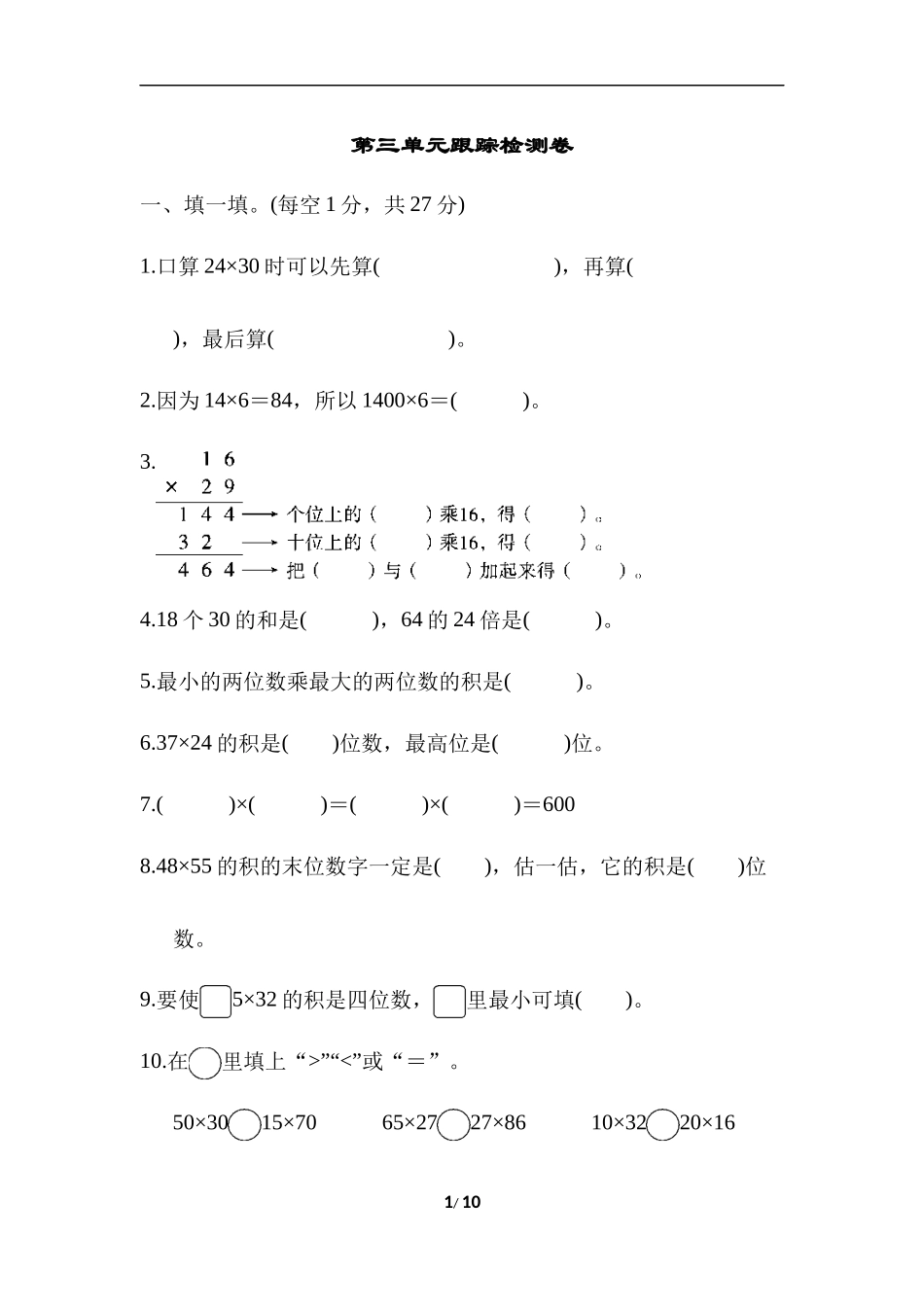 第三单元跟踪检测卷一、填一填。(每空1分,共27分)1.口算24×30时可以先算(),再算(),最后算()。2.因为14×6=84,所以1400×6=()。3.4.18个30的和是(),64的24倍是()。5.最小的两位数乘最大的两位数的积是()。...