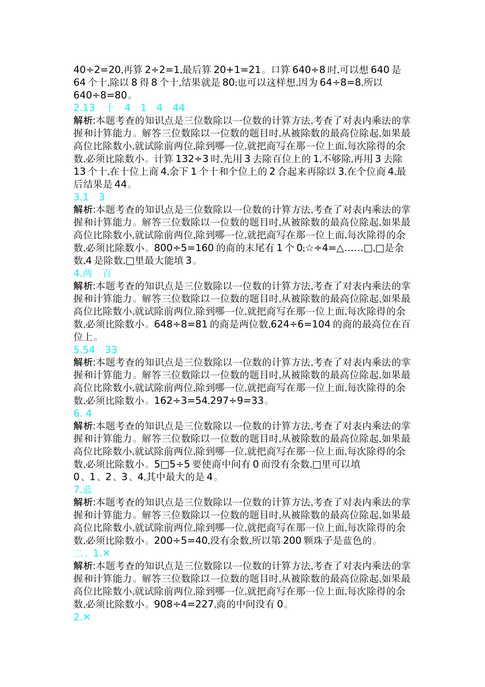 第一单元测试卷(2)时间:90分钟满分:100分分数:一、填一填。(23分)1.口算42÷2时,先算(),再算(),最后算()。口算640÷8时,可以想640是()个十,除以8得()个十,结果就是();也可以这样想,因为()÷8=(),所以640÷8=(...