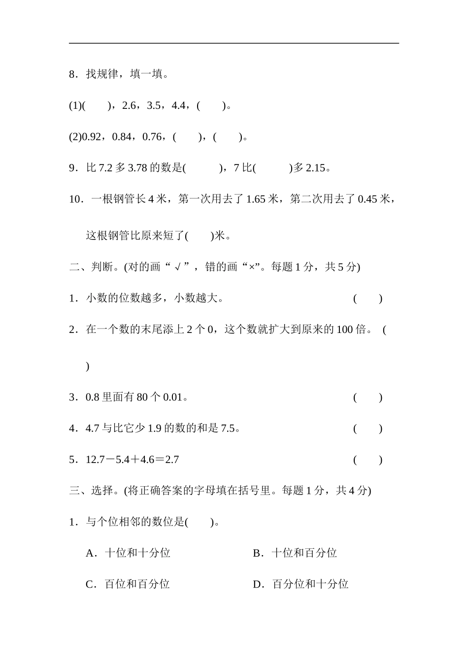 第一单元过关检测卷一、填空。(第4题3分,第6题5分,第7题3分,第8题2分,其余每空1分,共25分)1.在0.808中,右边的“8”在()位上,表示();左边的“8”表示的数是右边的“8”表示的数的()。2.5.87是由()个一、...