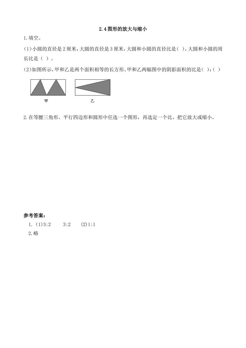 2.4图形的放大与缩小1.填空。(1)小圆的直径是2厘米,大圆的直径是3厘米,大圆和小圆的直径比是(),大圆和小圆的周长比是()。(2)如图所示,甲和乙是两个面积相等的长方形。甲和乙两幅图中的阴影面积的比是...