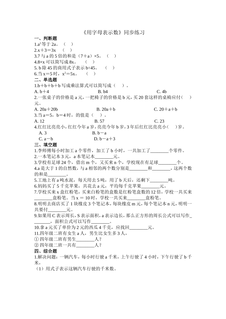 【北师大数学小学四年级下册】同步练习 5.1用字母表示数.doc_第2页