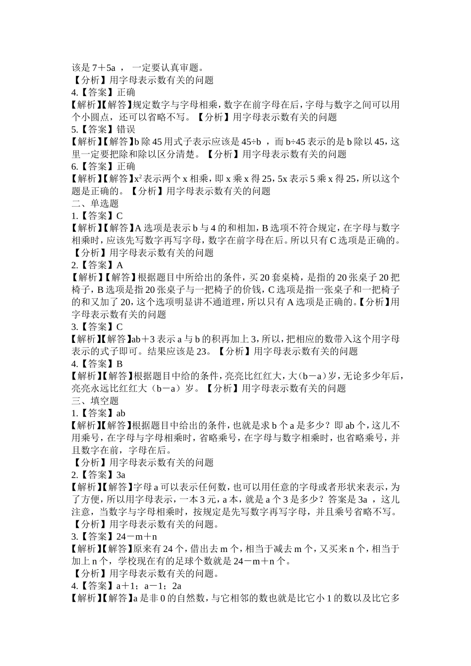 《用字母表示数》同步练习一、判断题1.a2等于2a。()2.x+3=3x()3.7与a的5倍的和是(7+a)×5。()4.8×x可以简写成8x。()5.b除45的商用式子表示b÷45。()6.当x=5时,x2=5x。()二、单选题1.b+b+b...