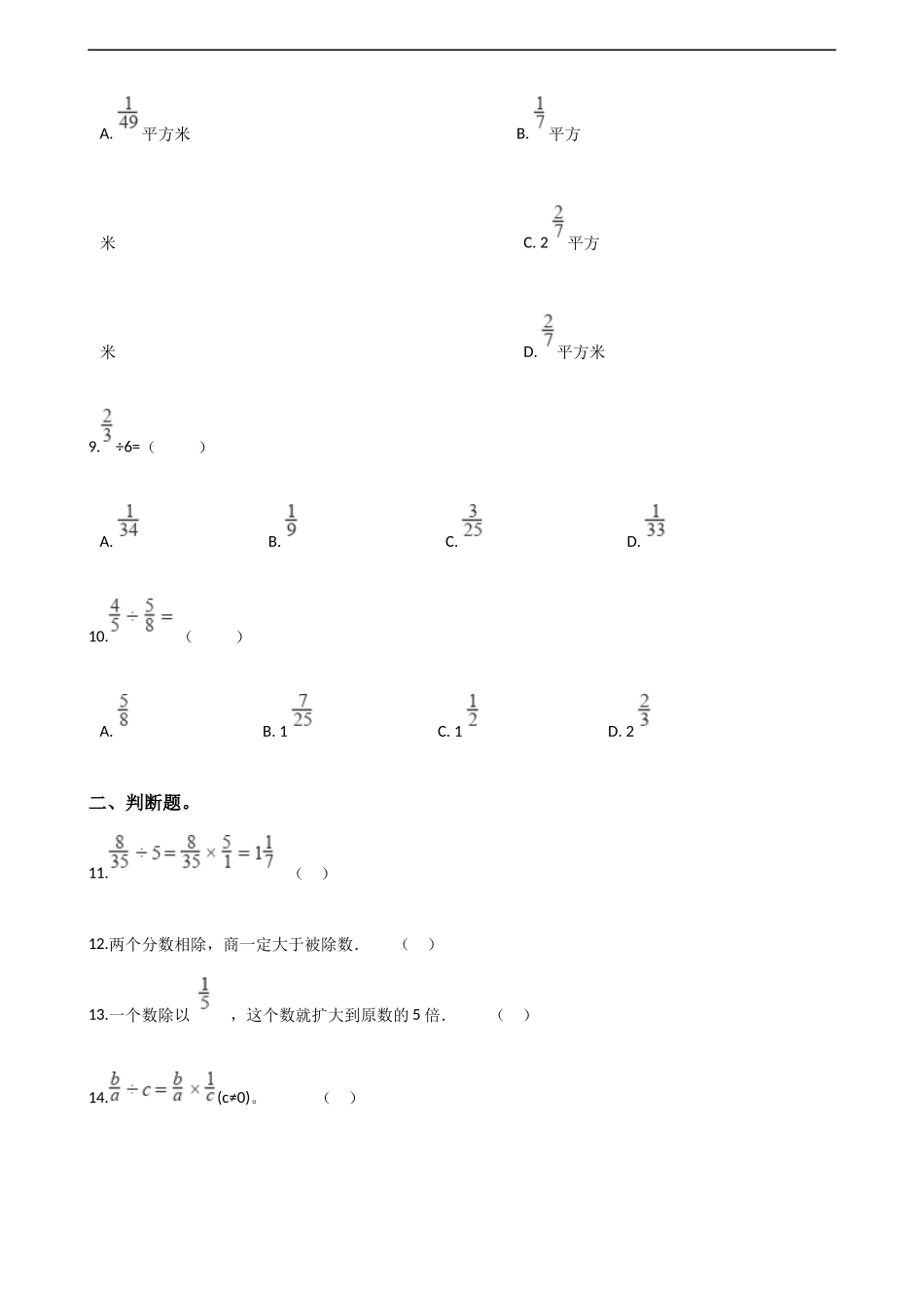 分数除法(三)一、单选题。1.=()A.B.C.D.2.一个数的2倍是,这个数是()A.B.C.D.3.10÷=()A.5B.4C.20D.114.一台碾米机小时碾米吨,碾1吨米要()小时。A.B.C.5.一台拖拉机小时耕地公顷,1小时耕地()A.公顷...