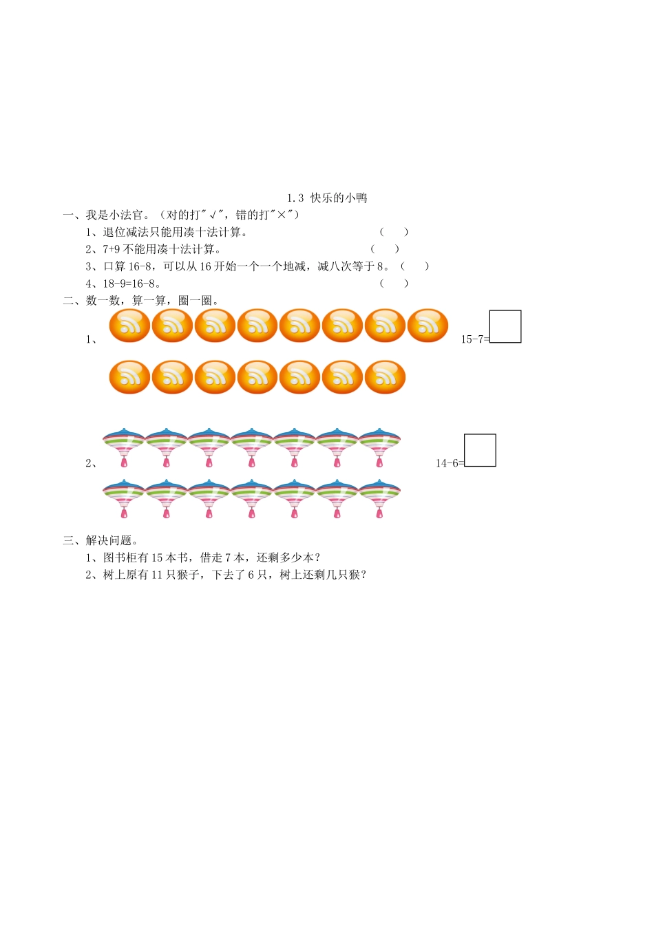 1.3快乐的小鸭一、我是小法官。(对的打"√",错的打"×")1、退位减法只能用凑十法计算。()2、7+9不能用凑十法计算。()3、口算16-8,可以从16开始一个一个地减,减八次等于8。()4、18-9=16-8。()二、数...