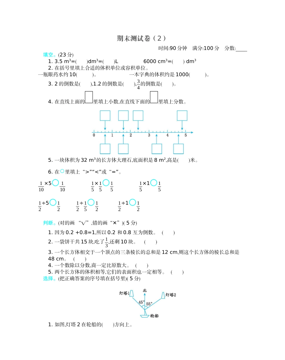 期末测试卷(2)时间:90分钟满分:100分分数:一填空。(23分)1.3.5m3=()dm3=()L6000cm3=()dm32.在括号里填上合适的体积单位或容积单位。一瓶眼药水约10()。一本字典的体积约是1000()。3.2的倒数是(),1.2的倒数是(),...